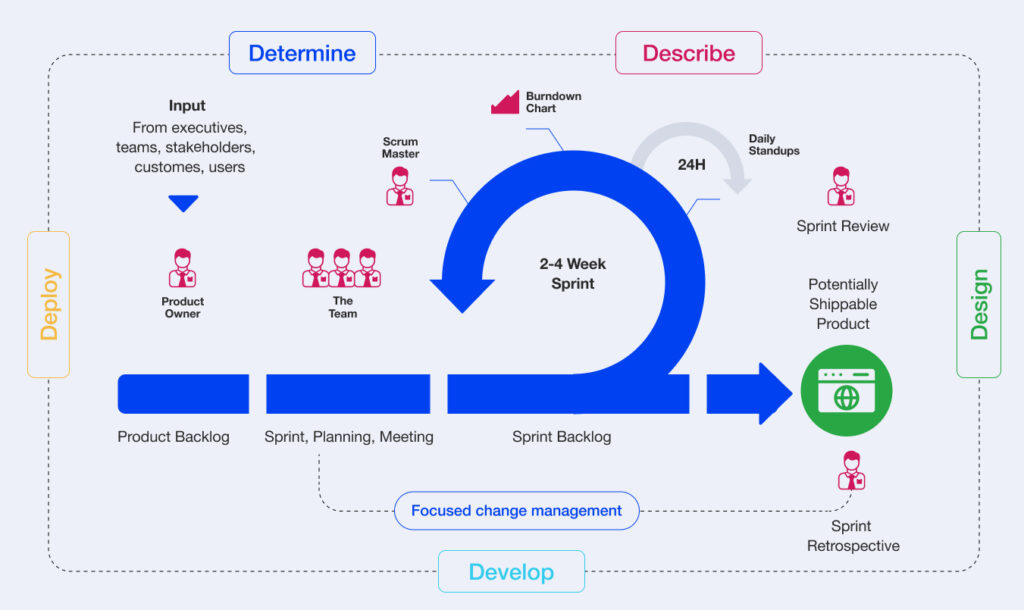 Ideal for projects with dynamic requirements and possibly evolving needs that change through the course of the project. It offers a continuous iteration ecosystem to improve customer experience that comprises of conceptualization, inception, creation, release, production, and re-engineering for business solutions.